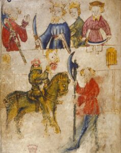The giant is green from head to foot, rides a green horse, and carries a massive green axe. He says that he has heard of the fame of Arthur’s court and has come to challenge one of them to a game of courage. Although Arthur is reluctant, he eventually agrees to the challenge but is interrupted by Gawain who tells Arthur that it’s not right for the King to accept the challenge. Gawain is the youngest and “least” of all the knights, so is the most expendable. Arthur should let Gawain face the challenge instead.